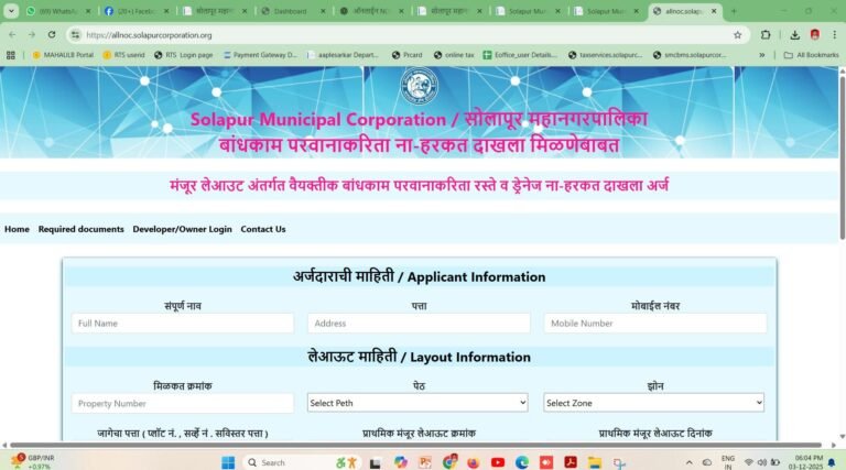 सोलापूर: सोलापूर महानगरपालिका प्रशासनाने शहर विकास प्रक्रियेत अत्यंत महत्त्वपूर्ण आणि क्रांतिकारी पाऊल उचलले आहे. मा. महाराष्ट्र शासनाच्या १५० दिवसांच्या कृती आराखड्यानुसार, महानगरपालिकेने बांधकाम परवाना (Building Permission) आणि अंतिम लेआऊट मंजुरीसाठी आवश्यक असलेले विविध विभागांचे ना-हरकत दाखले (NOC) प्राप्त करण्याची सुविधा आता पूर्णपणे ऑनलाईन उपलब्ध करून दिली आहे.